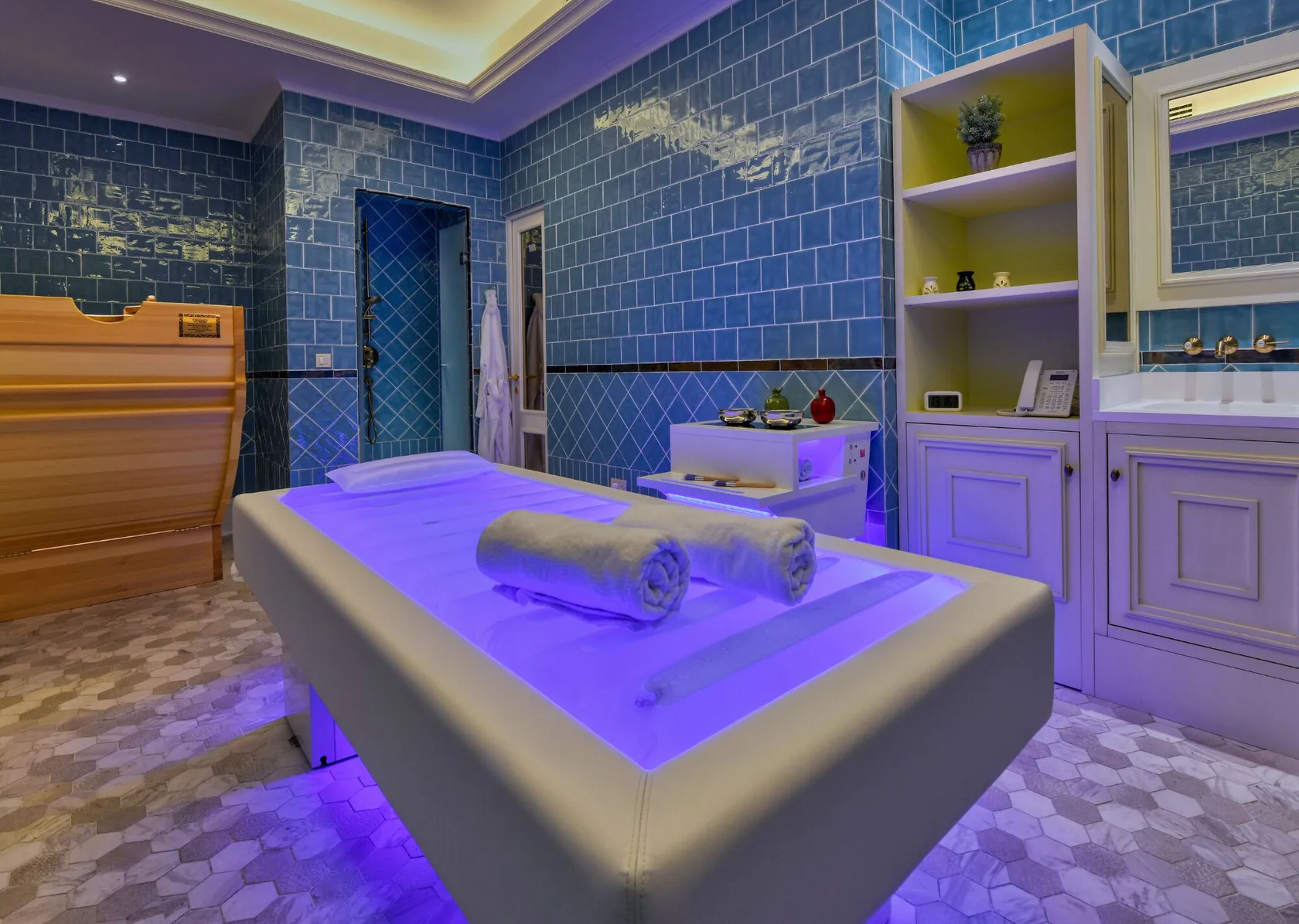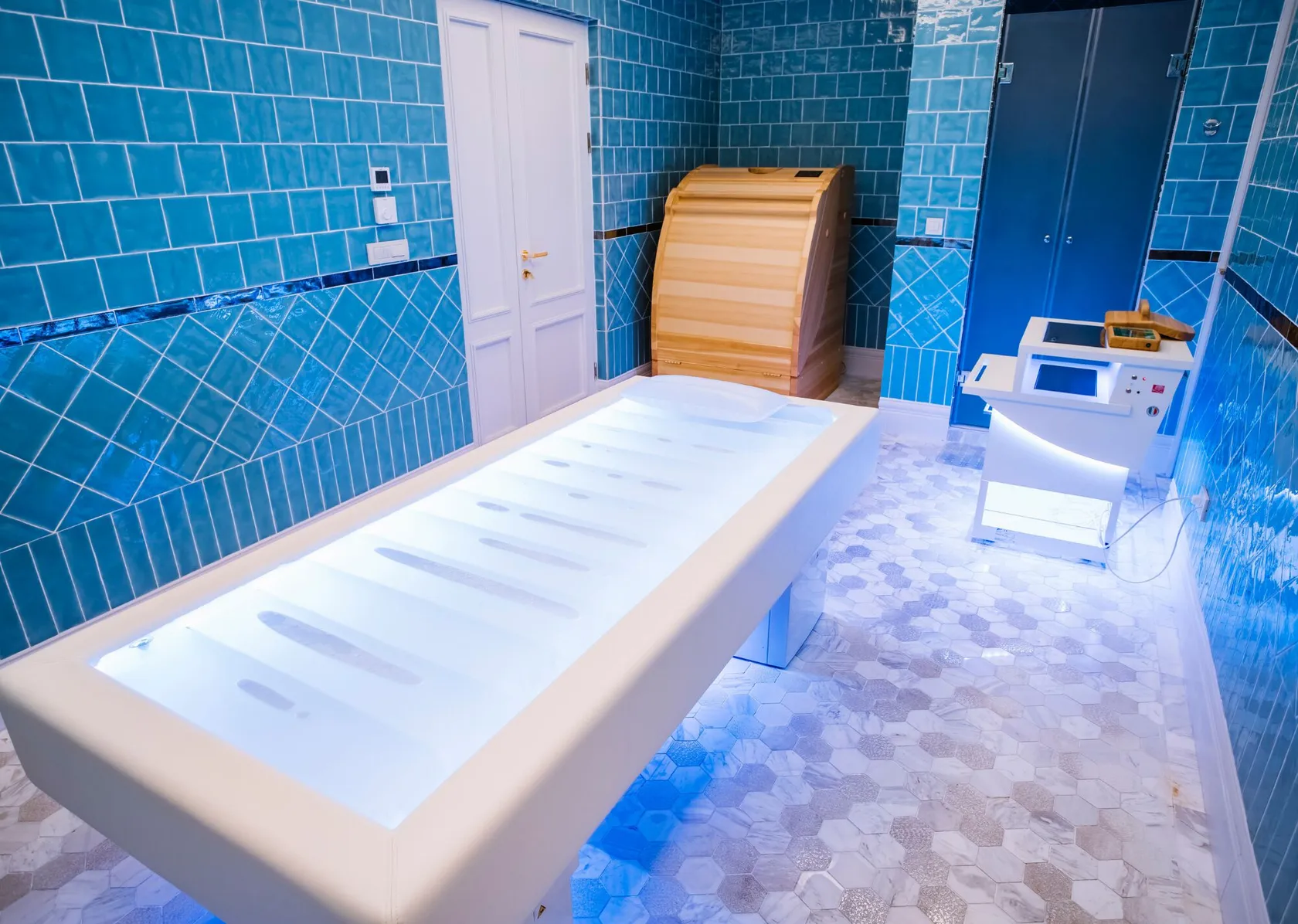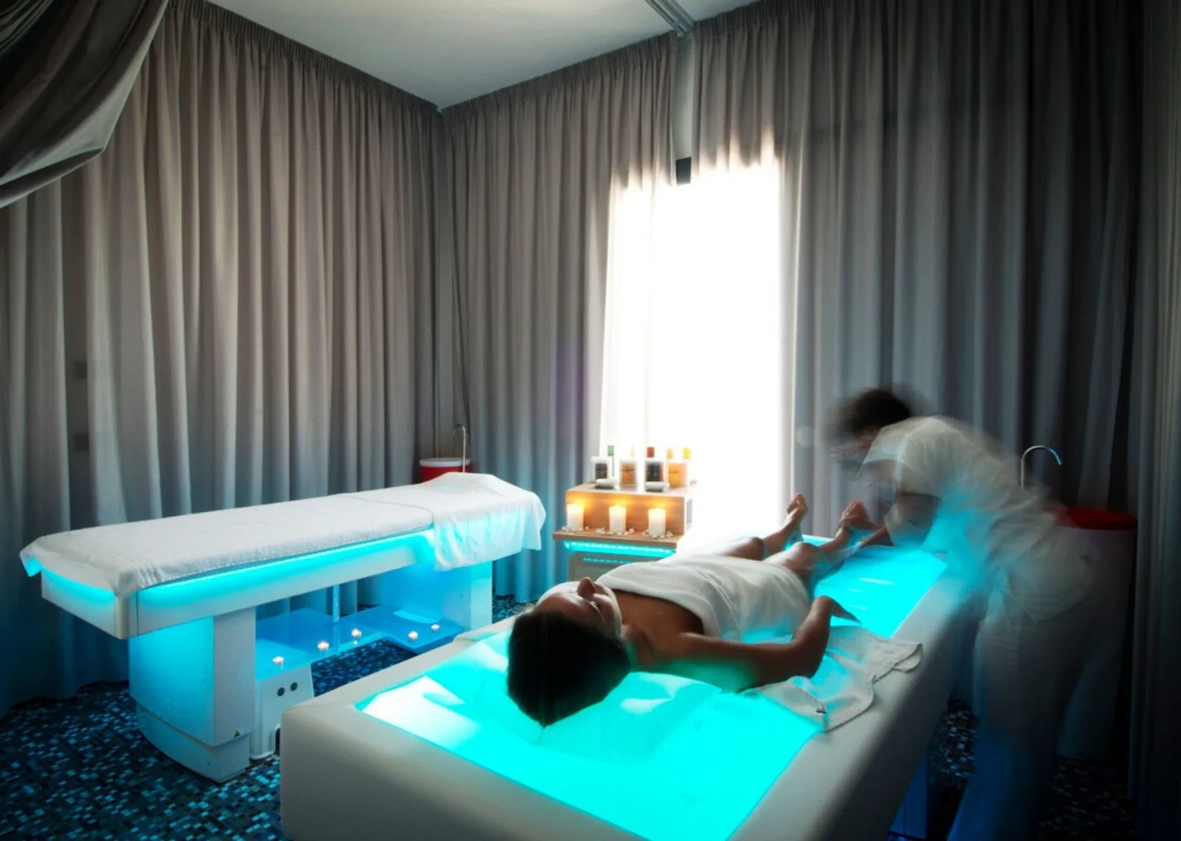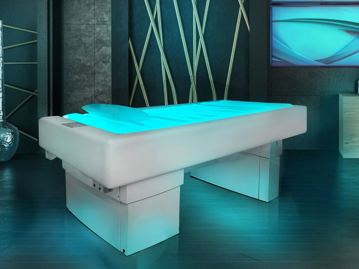 Ліжко Salus – багатофункціональне професійне рішення для масажу, косметичних і SPA процедур, а також оздоровчих ритуалів. Воно обладнане водяним матрацом із гідромасажем, музичним супроводом, ароматерапією та налаштовуваним світлодіодним підсвічуванням.