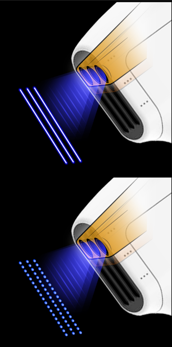 Три синхронізовані випромінювачі діють одночасно, забезпечуючи рівномірний розподіл енергії та скорочення тривалості процедури.